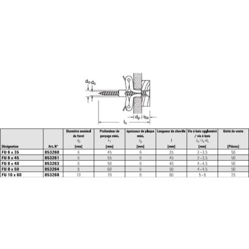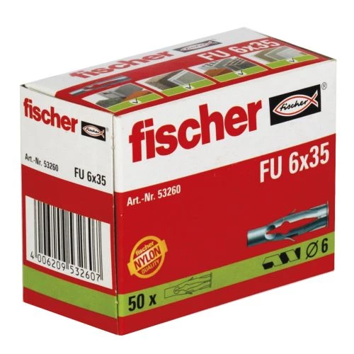 La cheville universelle FU s’installe facilement pour les matériaux de construction. La cheville FU est en nylon de haute qualité s’étend dans les matériaux pleins comme le béton ou le béton cellulaire. Dans les matériaux creux et en panneaux, la cheville se déploie également et assure ainsi une tenue maximale. De plus elle convient pour les vis à bois et les vis à bois aggloméré. Les lampes, les plinthes étagères légères et les armoires suspendues peuvent être fixées par montage traversant.