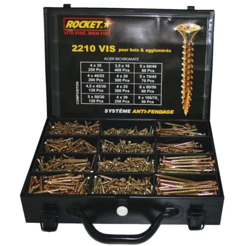 Ce coffret vis Pozidriv de la marque Rocket est une mallette 2210 composée de vis à tête fraisée, avec une empreinte cruciforme PZ2 acier zingué jaune.