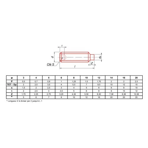 | Diamètre (mm) | 3, 4, 5, 6, 8, 10, 12, 14, 16, 20, n.c. |